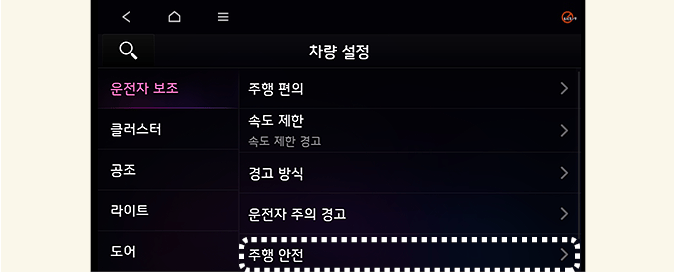 시동「ON」상태에서 클러스터의 사용자 설정 → 운전자 보조 → 주행 안전 또는 인포테인먼트 시스템의 설정 → 차량 → 운전자 보조 → 주행 안전을 차례로 선택하십시오.