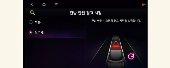 경고 시점을 보통으로 설정해도 전방 차량이 급제동하는 경우에는 경고가 느리게 느껴질 수 있습니다.