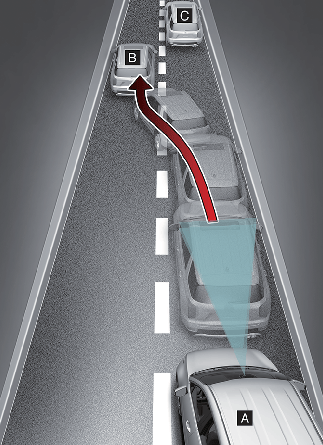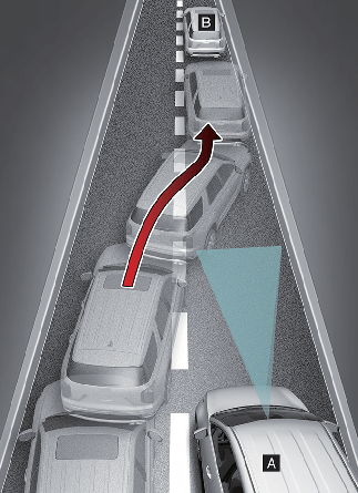 옆 차로의 차량[B] 및 이륜차가 자차(A)와 같은 차로로 차로를 변경할 때 센서의 감지 범위 안으로 들어올 때까지 차량[B] 및 이륜차를 인식하지 못할 수 있습니다. 갑자기 끼어드는 차량 및 이륜차는 센서가 늦게 인식할 수 있습니다. 항상 전방 도로 상황 및 주행 상태를 확인하고 주의하여 운전하십시오. 필요하면 브레이크 페달을 밟아 직접 속도를 조절하거나 스티어링 휠을 조작하십시오.