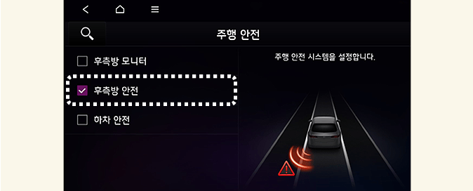 시동「ON」상태에서 클러스터의 사용자 설정 → 운전자 보조 → 주행 안전 → 후측방 안전 또는 인포테인먼트 시스템의 설정 → 차량 → 운전자 보조 → 후측방 안전을 차례로 선택하십시오. 기능의 사용 여부를 설정할 수 있습니다.