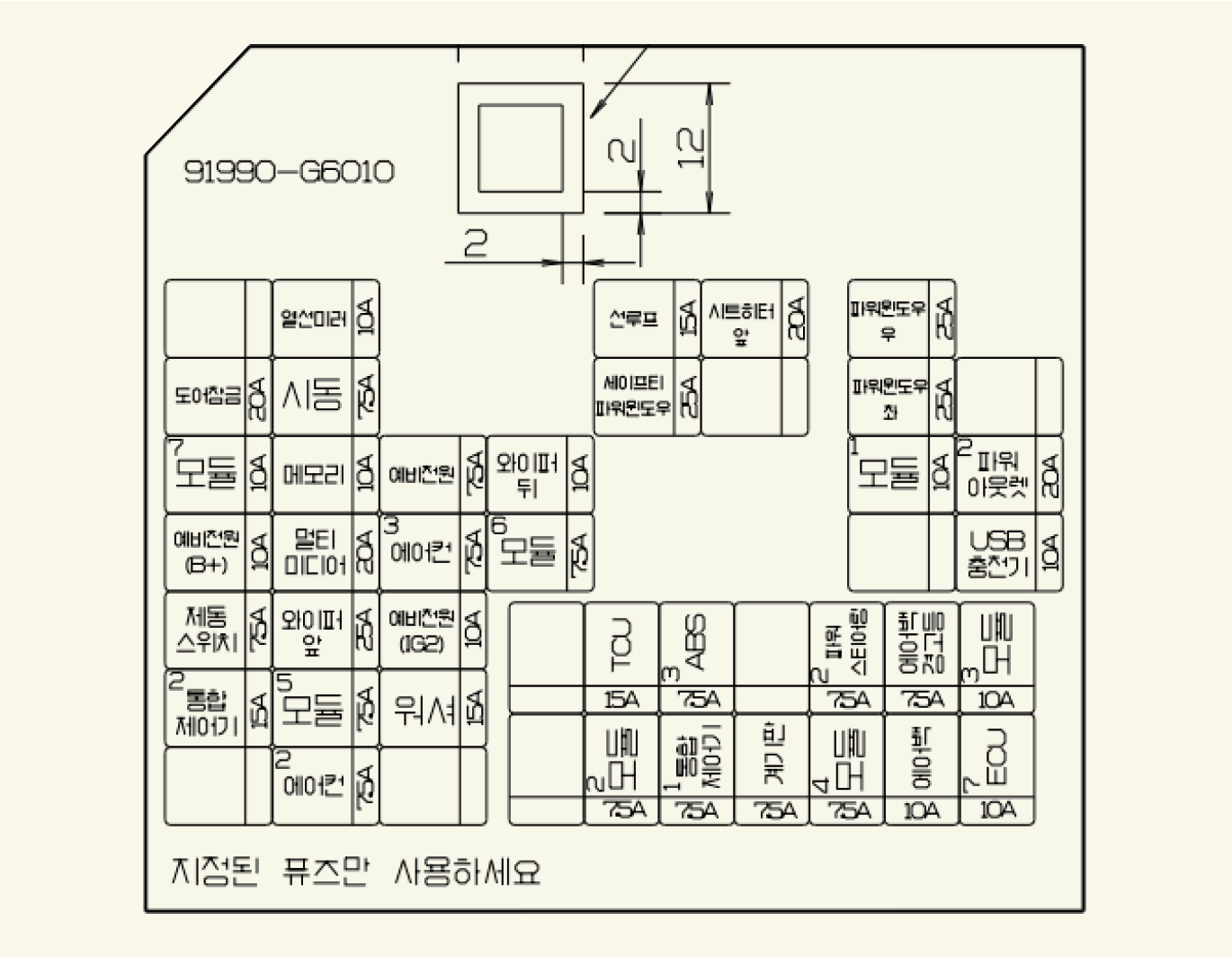 * 사양에 따라 퓨즈/릴레이 라벨이 실제 장착된 라벨과 상이할 수 있으니 박스 커버 안쪽에 부착되어 있는 퓨즈/릴레이 라벨을 참조하십시오.