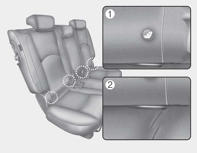 어린이 보조 좌석 심볼이 2열 좌석 등받이 하단부에 위치하여 어린이 보조 좌석용 하부 부착구의 위치를 나타냅니다.