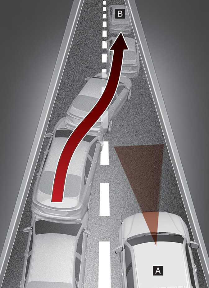 옆 차로의 차량(B)이 자차(A)와 같은 차로로 차로를 변경할 때는 센서의 감지 범위 안으로 들어올 때까지 차량(B)을 인식하지 못할 수 있습니다. 갑자기 끼어드는 차량은 센서가 늦게 인식할 수 있습니다. 항상 전방 도로 상황 및 주행 상태를 확인하고 주의하여 운전하십시오. 필요하면 직접 속도를 조절하십시오.