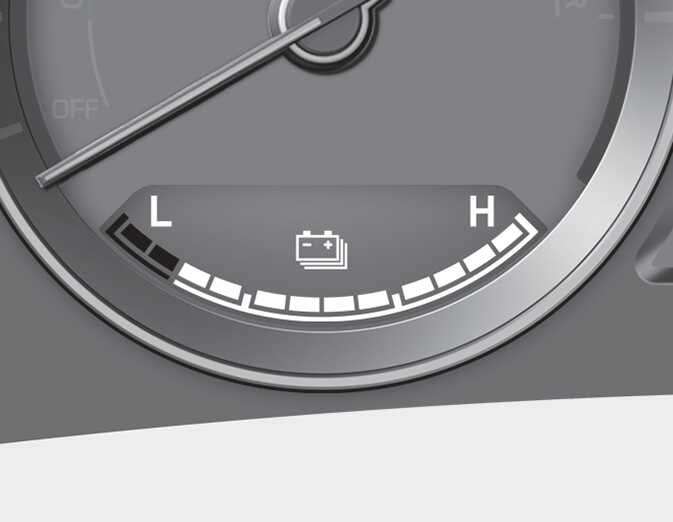 표시계에서 L(Low) 위치는 구동용 배터리 잔량이 부족하여 충전이 필요한 상태를, H(High) 표시는 구동용 배터리 완전 충전 상태를 표시합니다.