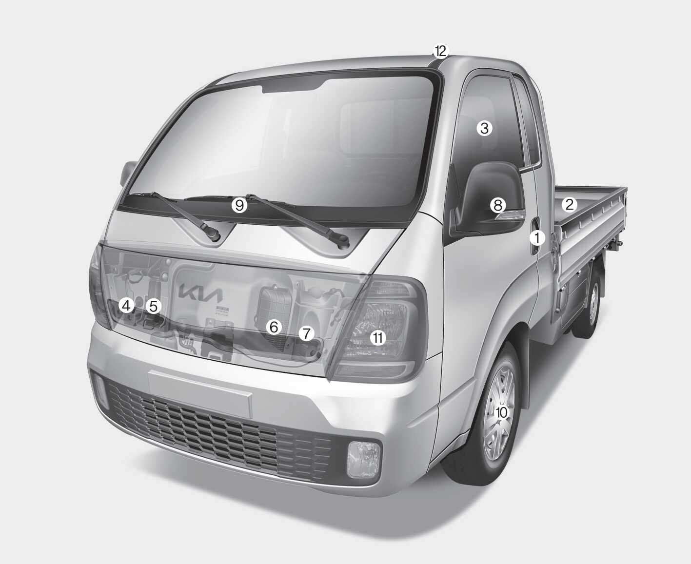 외관도 I OPUEV011001 본 도안은 실제 차량과 다를 수 있습니다. 도어 도어 적재함 적재함 유리창 유리창 개폐 장치 후드 후드 서비스 인터락 커넥터(사용 설명서(요약본)의 "서비스 인터락 커넥터" 참고) 공조 장치용 에어필터 공조 장치용 에어필터 점검 와셔액 저장용기 와셔액 점검 미러 미러 와이퍼 와이퍼/와셔 휠/타이어 타이어 및 휠 점검, 타이어 및 휠 전조등 전구의 교체 안테나 안테나