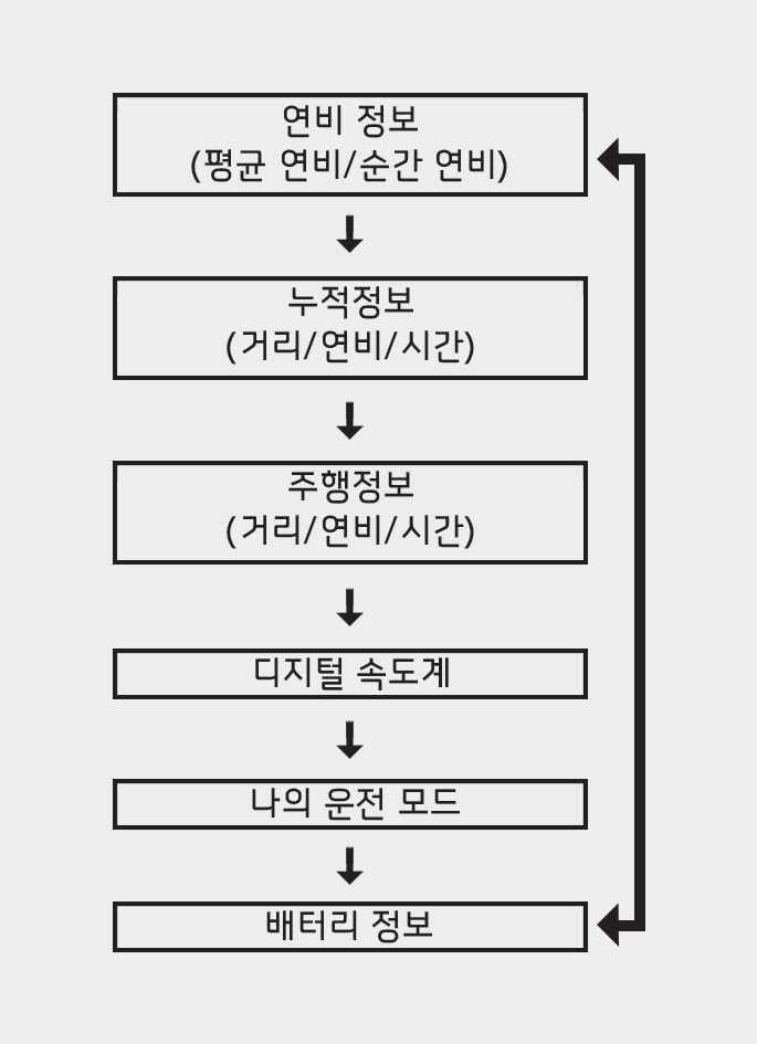 자동 초기화: 시동을 끈 후 4시간 경과 또는 배터리를 약 10% 이상 충전 시 평균연비가 자동 초기화됩니다. LCD 표시창의 사용자 설정 모드에서 자동 초기화 기능을 해제하거나 설정할 수 있습니다.