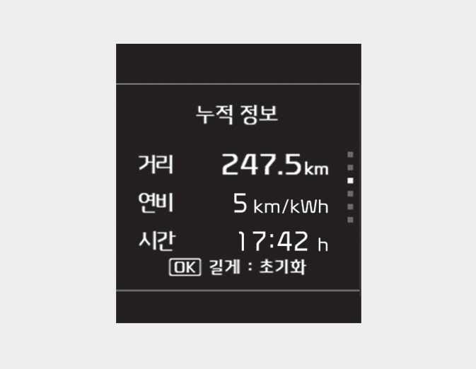 주행 정보가 표시된 상태에서 OK(확인) 버튼을 1초 이상 누르면 초기화됩니다.