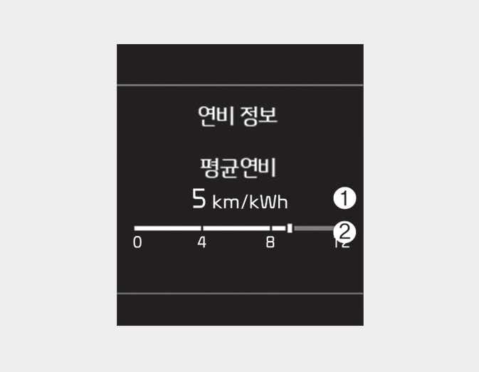 평균연비 초기화(--.-) 시점부터 현재까지의 주행 거리와 구동용 배터리 소모량을 누적 계산하여 평균연비를 표시합니다.