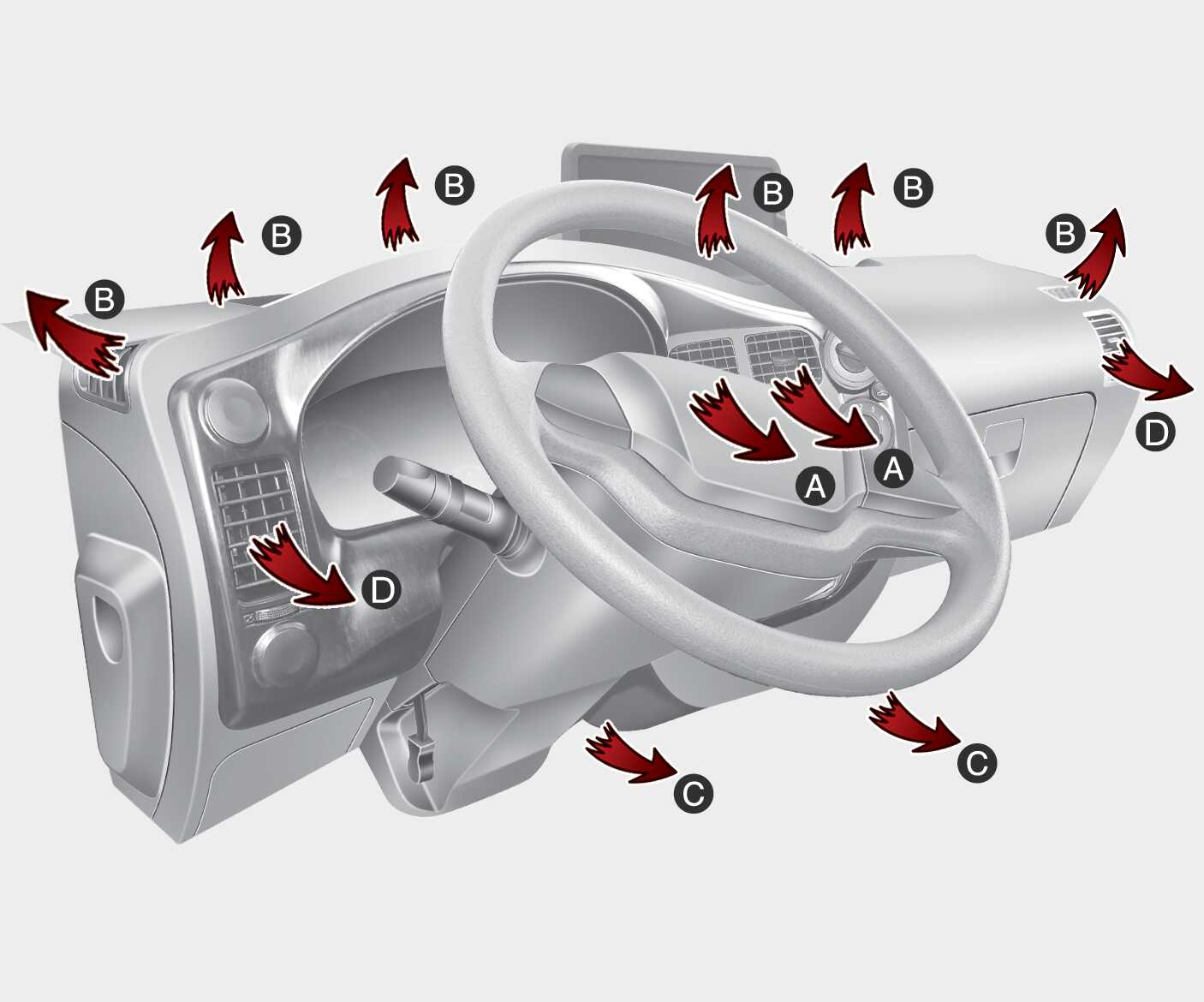 주로 발끝으로 바람이 나오게 할 때 사용합니다.(일반적으로 난방을 할 때의 위치입니다.) 앞유리 습기 발생 예방 차원에서(B), (D) 방향에서도 약간의 바람이 나옵니다. |