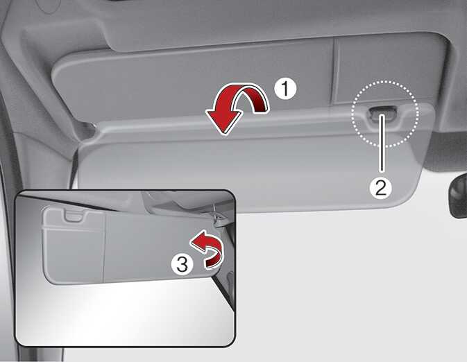 선바이저를 사용하려면 당겨 내리십시오(1). 측면을 차단하고자 할 때는 당겨 내린 후 브래킷(2)에서 분리하여 측면으로 돌리십시오(3).