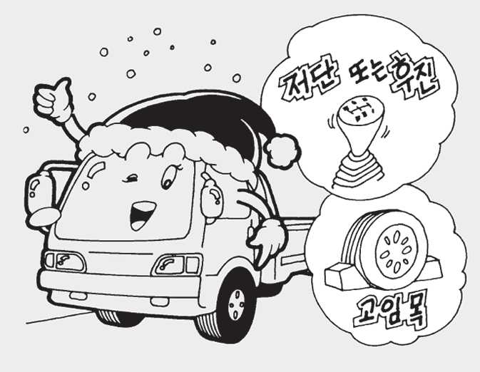 눈길, 빙판길을 주행할 때는 스노우 타이어 또는 규격에 맞는 타이어 체인을 장착하고, 급발진, 급가속, 급제동을 삼가십시오.