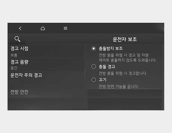 충돌 경고를 선택하면 충돌 위험 상황에서 경고음만 울립니다. 브레이크 제어는 보조하지 않으므로 운전자가 직접 브레이크 페달을 조작해야 합니다.