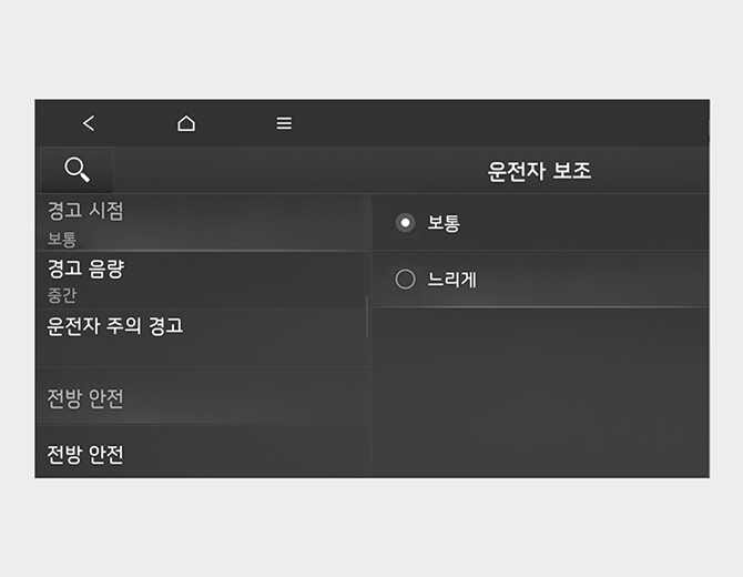 보통은 기본 설정값으로 일반적인 주행 환경에서 사용하십시오. 보통 상태의 경고가 너무 민감하게 느껴지면, 느리게로 변경하여 사용하십시오.