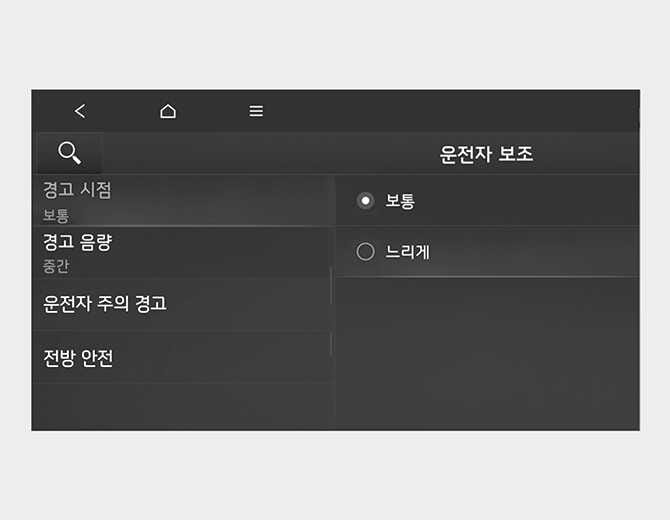 보통은 기본 설정값으로 일반적인 주행 환경에서 사용하십시오. 보통 상태의 경고가 너무 민감하게 느껴지면, 느리게로 변경하여 사용하십시오.