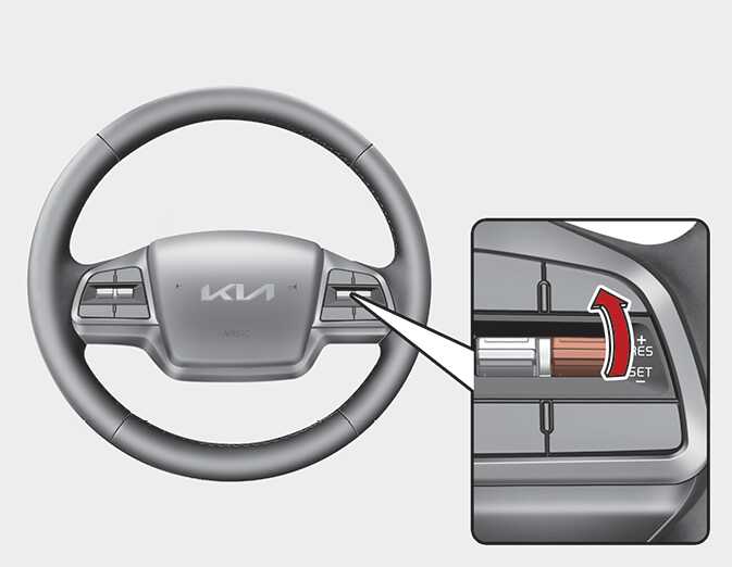 설정속도 증가 OPUEV0510361 「RES +」 스위치를 위로 짧게 올릴 때마다 1 km/h씩 속도가 증가합니다. 「RES +」 스위치를 길게 밀어 올리면 10의 배수로 설정속도가 증가합니다. 원하는 속도가 되면 손을 떼십시오. 110 km/h까지 속도를 설정할 수 있습니다.