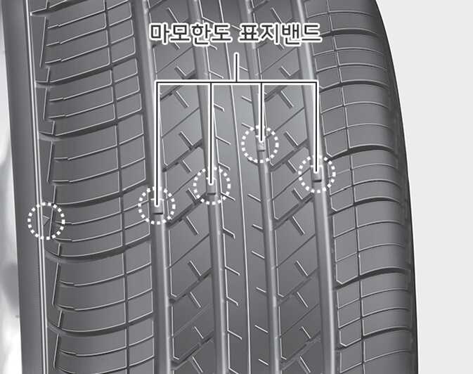 이것은 타이어 트레드부가 마모한도에 다다랐다는 것을 의미합니다. 이때는 타이어를 교체하십시오. 편마모 등 이상 마모 현상이 나타난 타이어는 마모한도 표시 밴드가 모든 트레드부에 나타나기 전이라도 교체하십시오.