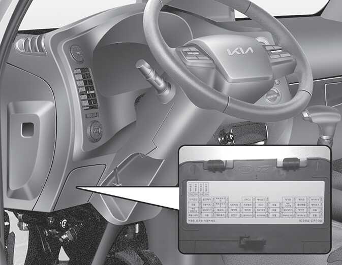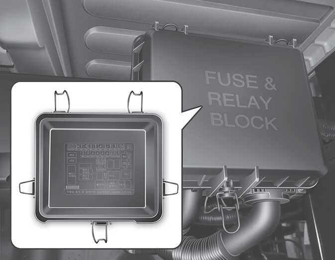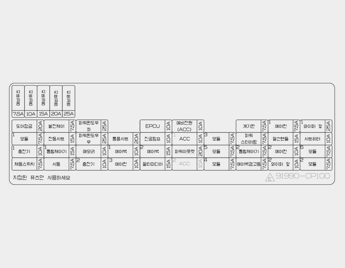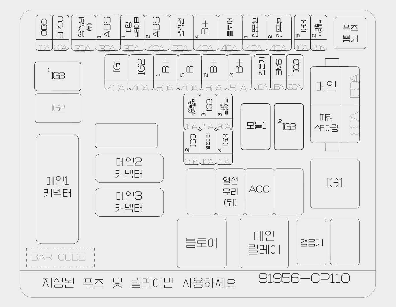 사양에 따라 퓨즈/릴레이 라벨이 실제 장착된 라벨과 상이할 수 있으니 박스 커버 안쪽에 부착되어 있는 퓨즈/릴레이 라벨을 참고하십시오.