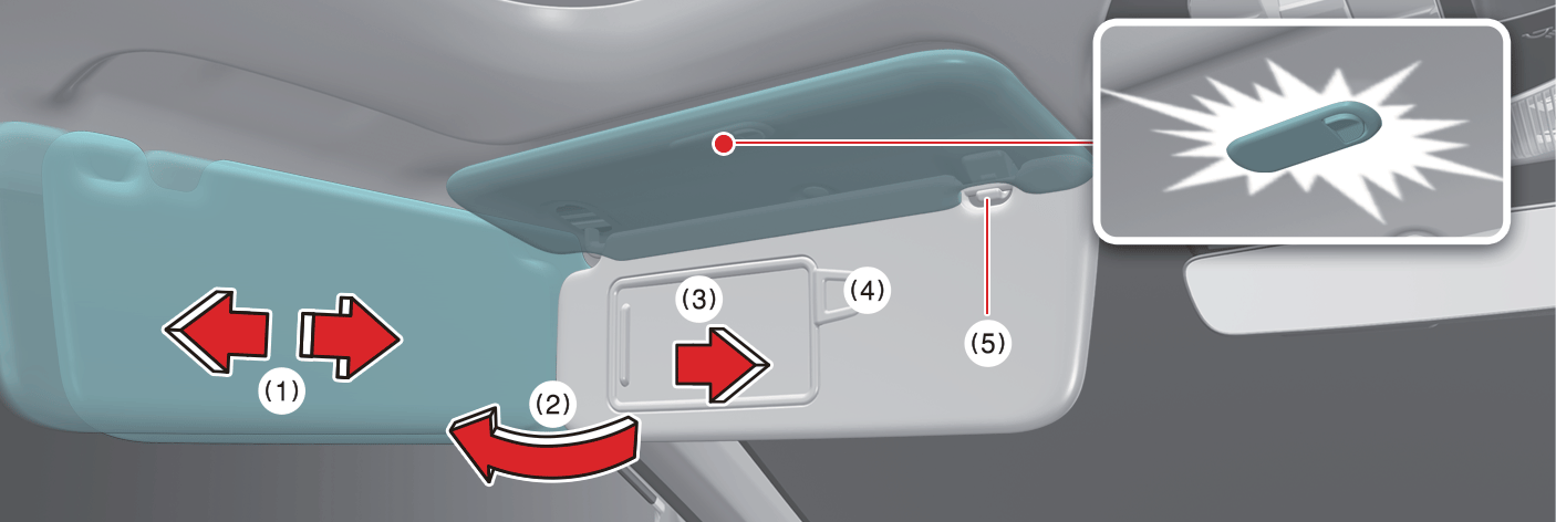 Slide the sun visor if necessary (1, if equipped). Pull down and slide the mirror cover (3) to use the vanity mirror. The ticket holder (4, if equipped) is provided for the purpose of holding a tollgate ticket.