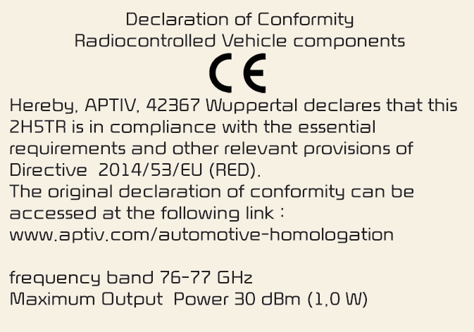 The radio frequency components (Front Corner Radar/Rear Corner Radar) complies (if equipped):