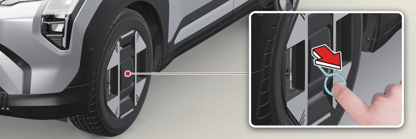 Take out the remover tool in the Tyre Mobility Kit. Insert the tool to the hole and pull out the wheel cover.