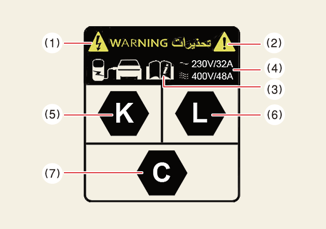 5–7: Symbols for charging type. For further details, refer to Electric charging label symbol table (For Europe) . |