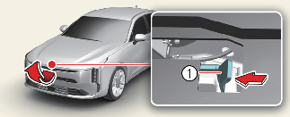 차량의 앞에서 엔진 후드를 약간 들어 올리고, 중앙에 위치한 2차 열림 레버(1)를 왼쪽으로 밀고 있는 상태에서 후드를 위로 들어 올리십시오.