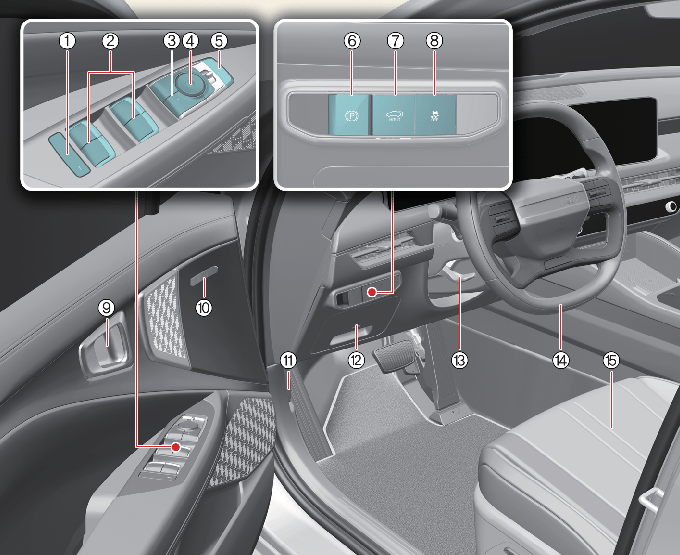 * 실제 차량과 다를 수 있습니다(스위치의 형상 및 배열은 사양 적용에 따라 달라질 수 있습니다).