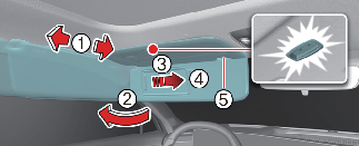 선바이저 안쪽의 커버(3)를 밀면 거울이 있으며 선바이저 안쪽에 있는 램프가 켜집니다.