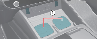 중앙 콘솔 앞쪽에 스마트폰 무선 충전을 위한 시스템이 적용되어 있습니다. 스마트폰을 충전하기 위해서는 차량의 도어를 모두 닫고 시동 버튼「ON」상태에서 무선 충전이 지원되는 스마트폰을 충전 패드(1) 위에 올려놓으십시오. 무선 충전 패드 2개가 적용되어 2개의 스마트폰을 동시에 충전할 수 있습니다.