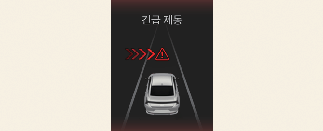 긴급 제동에 의한 정차 시 클러스터 등에 경고문이 표시됩니다. 안전을 위해 즉시 브레이크 페달을 밟고, 주변 상황을 확인하십시오.