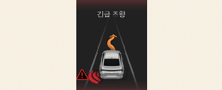 」 점멸, 경고문, 경고음, 스티어링 휠 진동(사양 적용 시)을 통해 긴급 조향을 알립니다. 조향 제어가 작동하여 전방 대향차 및 이륜차와의 충돌을 피할 수 있도록 도와줍니다.