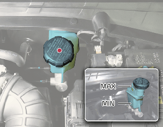 브레이크액 탱크의 액량이「MAX」보다 초과되었다면 운전 도중 브레이크액이 흘러 넘쳐서 주변 부품의 손상을 줄 수 있으므로 브레이크액 보충 시 브레이크액량이「MAX」를 초과하지 않게 주의하십시오.