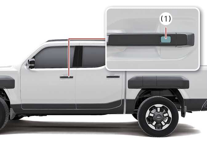 (버튼 타입의 경우) 앞좌석 실외 도어 손잡이에 있는 도어 잠금/잠금 해제 버튼(1)을 누르십시오.
