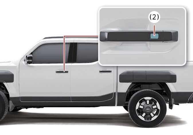 (터치 센서 타입의 경우) 앞좌석 실외 도어 손잡이에 있는 음각 부분으로 된 도어 잠금 센서부(2)를 터치하십시오.