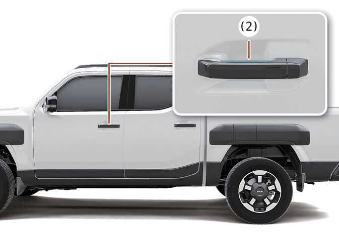 (터치 센서 타입의 경우) 앞좌석 도어 손잡이 포켓 안에 손을 넣어 실외 도어 손잡이 안쪽에 위치한 도어 잠금 해제 센서부(2)를 터치하십시오.