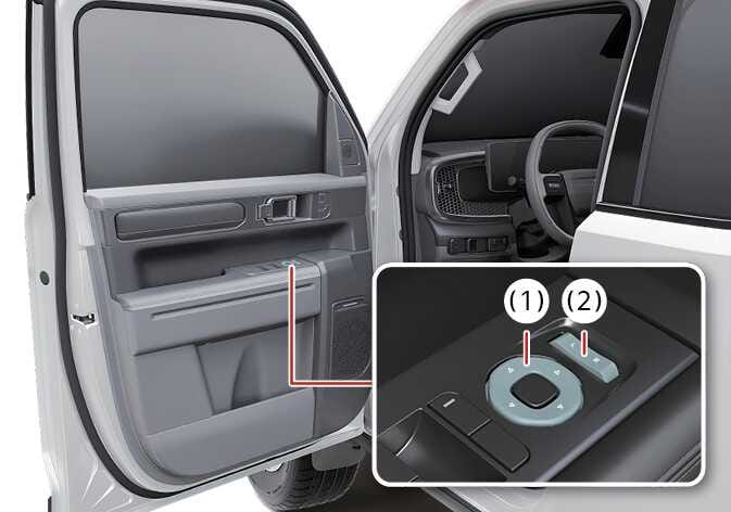 미러 조절 선택 스위치(2)를 오른쪽(R)으로 미십시오. 미러 조절 스위치(1) '▶'부분을 눌러 실외 미러를 조절하십시오.