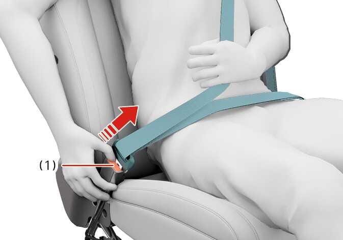 해제 방법 N_TK25B039 버클에 있는 해제 버튼(1)을 누른 상태에서 플레이트를 당겨 내십시오. 플레이트가 유리창에 부딪히지 않도록 플레이트를 잡고 천천히 안전벨트가 감기게 하십시오.