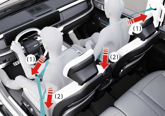 안전벨트 프리텐셔너는 전방에 강한 충격을 받을 때 안전벨트를 순간적으로 잡아당겨 좌석에 탑승자의 몸이 밀착되도록 하므로 프리텐셔너 효과를 높이기 위해서는 반드시 안전벨트를 느슨하거나 꼬이지 않도록 착용하고 바른 자세로 앉아 있어야 합니다.