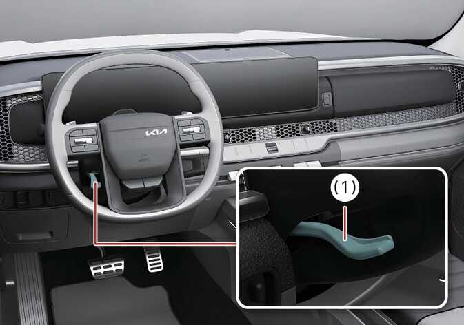 스티어링 휠 조절 레버(1)를 위로 올려 원위치한 다음 스티어링 휠이 확실하게 고정되었는지 확인하십시오.