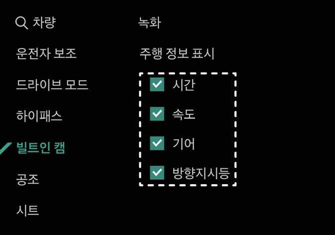 빌트인 캠 영상에 다양한 주행 정보를 기록할 수 있으며, 주행 정보 표시 메뉴에서 원하는 항목을 선택할 수 있습니다.