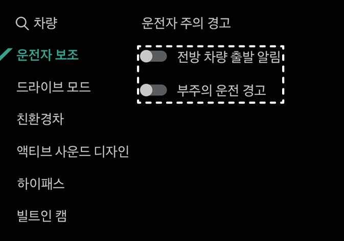 운전자 주의 경고 설정 N_TK25Z208 시동 ON 상태에서 인포테인먼트 시스템의 설정 > 차량 > 운전자 보조 > 운전자 주의 경고를 차례로 선택하십시오. 각 기능의 사용 여부를 설정할 수 있습니다. 전방 차량 출발 알림: 정차 중에 전방 차량이 출발했을 때 알려 줍니다. 부주의 운전 경고: 부주의 운전 경고를 켜고 끌 수 있습니다.
