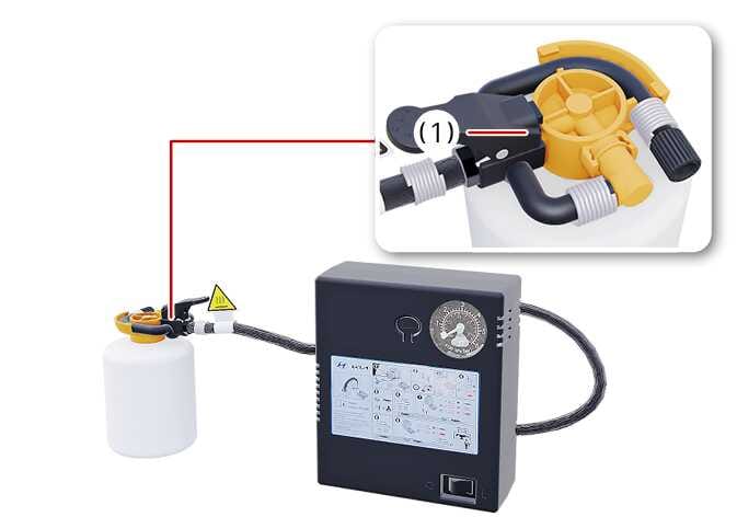 컴프레서 측 주입 호스를 실런트 용기 주입 호스 연결부에 연결하여 고정하십시오(1). 실런트 용기를 주입 호스가 위를 향하도록 세워 두십시오.