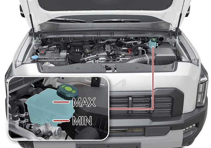브레이크액 탱크의 액량이 MAX보다 초과되었다면 운전 도중 브레이크액이 흘러넘쳐서 주변 부품의 손상을 가져올 수 있으므로 브레이크액 보충 시 브레이크액량이 MAX를 초과하지 않게 주의하십시오.