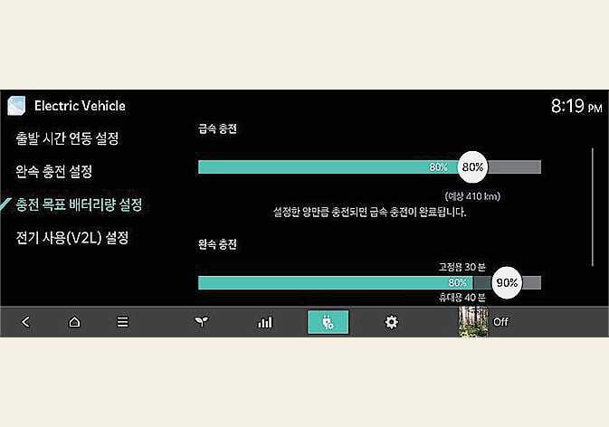 현재 남은 배터리로 주행 가능 거리, 남은 배터리양, 충전 방식에 따른 충전 예상 소요 시간을 확인할 수 있습니다.