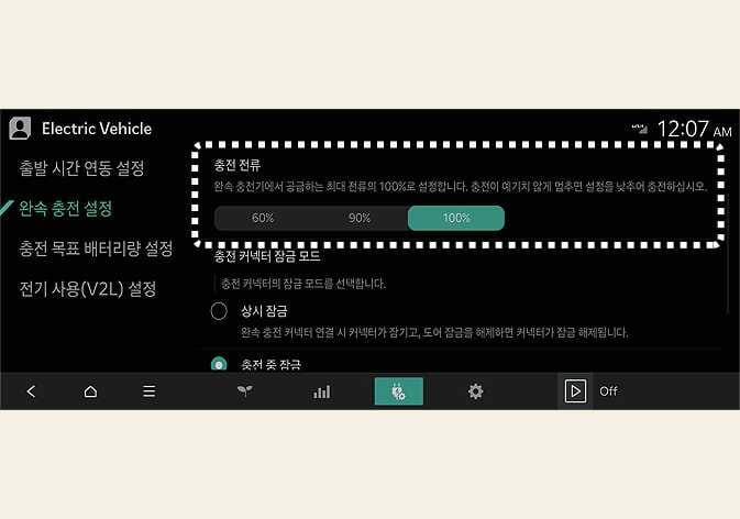 완속 충전을 할 때 고정용 또는 휴대용 충전 케이블에 적합한 완속 충전 전류를 선택할 수 있습니다.
