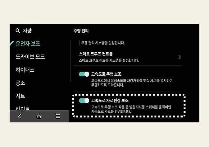 고속도로 차로변경 보조 기능을 선택하면 안전하게 차로를 변경하도록 도와줍니다. |