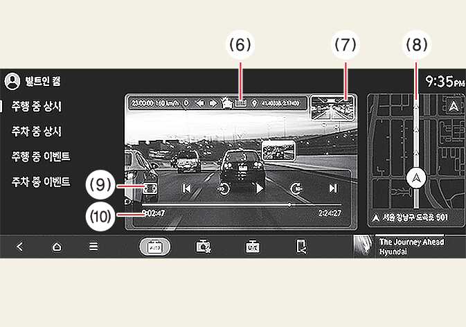 (6) 기록된 주행 정보 표시 (7) 전후방 영상 선택 (8) 녹화 위치 (9) 전체 화면/전체 화면 취소, 재생 제어 (10) 재생바 |
