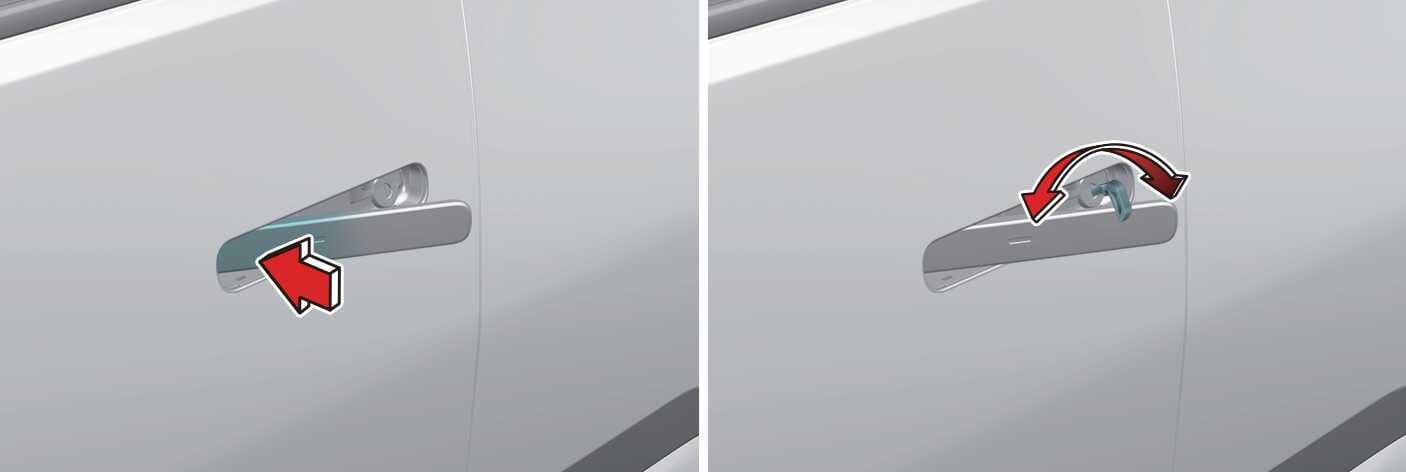 비상키를 이용한 도어 잠금 및 해제 OSV034007_2 작동 방법 실외 도어 손잡이 앞부분을 누르면 뒷부분이 나옵니다. 앞부분을 누른 상태에서 비상키를 키 홈에 꽂고 좌우로 돌려 운전석 도어를 잠그거나 잠금을 해제할 수 있습니다.