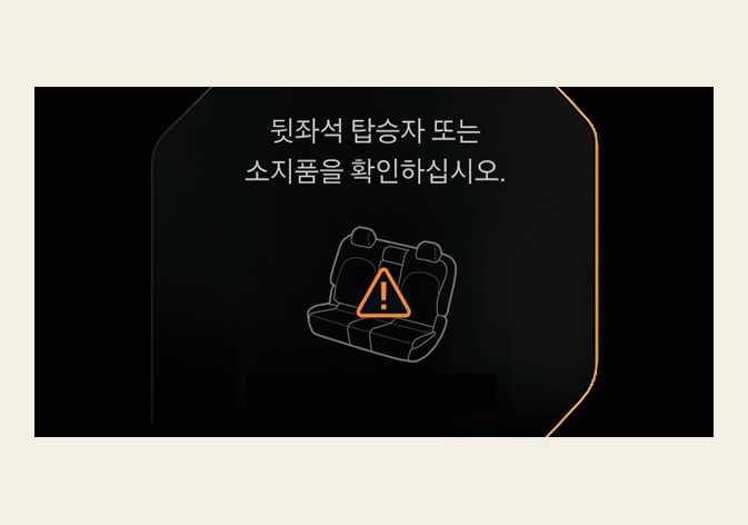 후석 승객 알림은 실제로 뒷좌석에 물건 또는 탑승자가 있는지 감지할 수 없습니다. 뒷좌석 도어를 열고 닫으면 운전자에게 뒷자리를 확인하도록 정보를 줍니다. 차량에서 내릴 때는 항상 뒷좌석에 탑승자가 있는지 확인하시기 바랍니다.