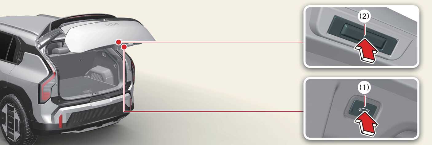 테일게이트 안쪽에 위치한 파워 테일게이트 열림/닫힘 버튼(1)을 누른 상태에서 알림음이 울릴 때까지 차량 바깥에 위치한 파워 테일게이트 열림/닫힘 버튼(2)을 길게 누르십시오.